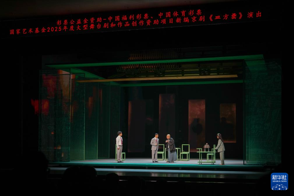 4月22日、23日晚,國家藝術基金2025年度大型舞臺劇和作品創作資助項目——京劇《皿方罍》在湖南大劇院上演。新編京劇《皿方罍》由湖南省京劇保護傳承中心創排,以國寶皿方罍百歲流轉的真實史料為依據,講述了1992年至2014年間,流失海外的皿方罍器身三度現世,終在多方努力下身蓋合一、完罍歸湘的故事。該劇還運用紗幕投影技術,打破傳統京劇的舞臺限制,營造出裸眼3D效果,使國寶故事更具感染力。