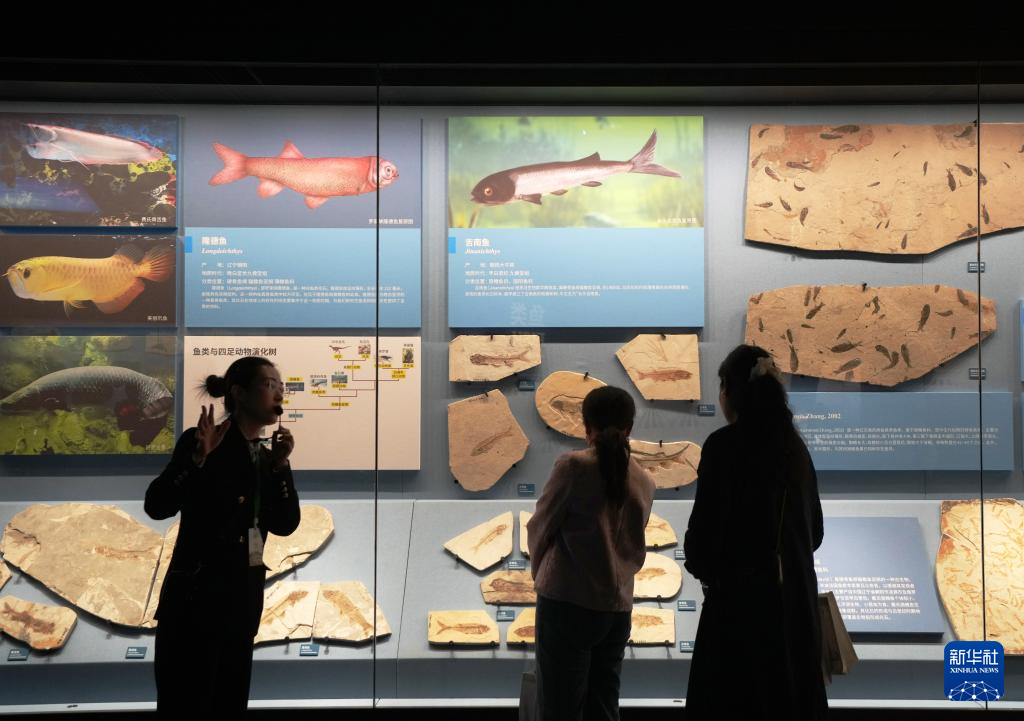 4月27日,游客在遼寧朝陽古生物化石博物館內參觀。