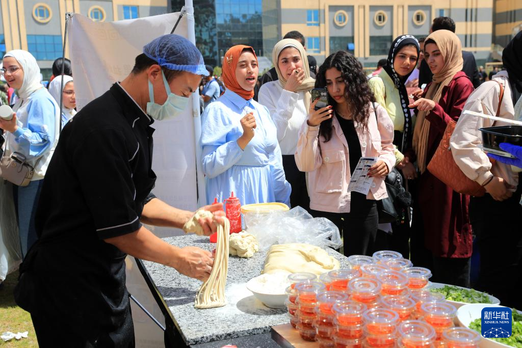 4月27日,學生在埃及開羅舉行的“國際中文日”活動上觀看拉面制作。