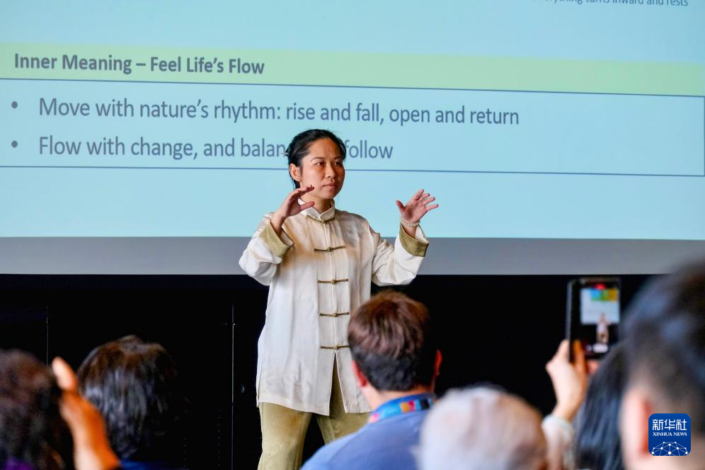4月27日,在新西蘭克賴斯特徹奇,上海中醫藥大學專家演示八段錦。