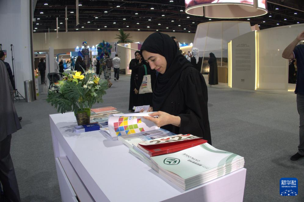 4月27日,在阿聯酋阿布扎比國家展覽中心,當地讀者翻閱中國展臺的圖書。
