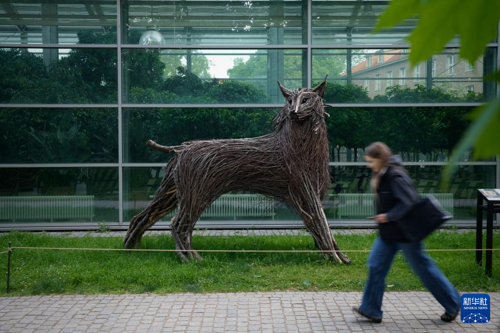 這是5月6日在波蘭首都華沙拍攝的猞猁樹枝雕塑。
