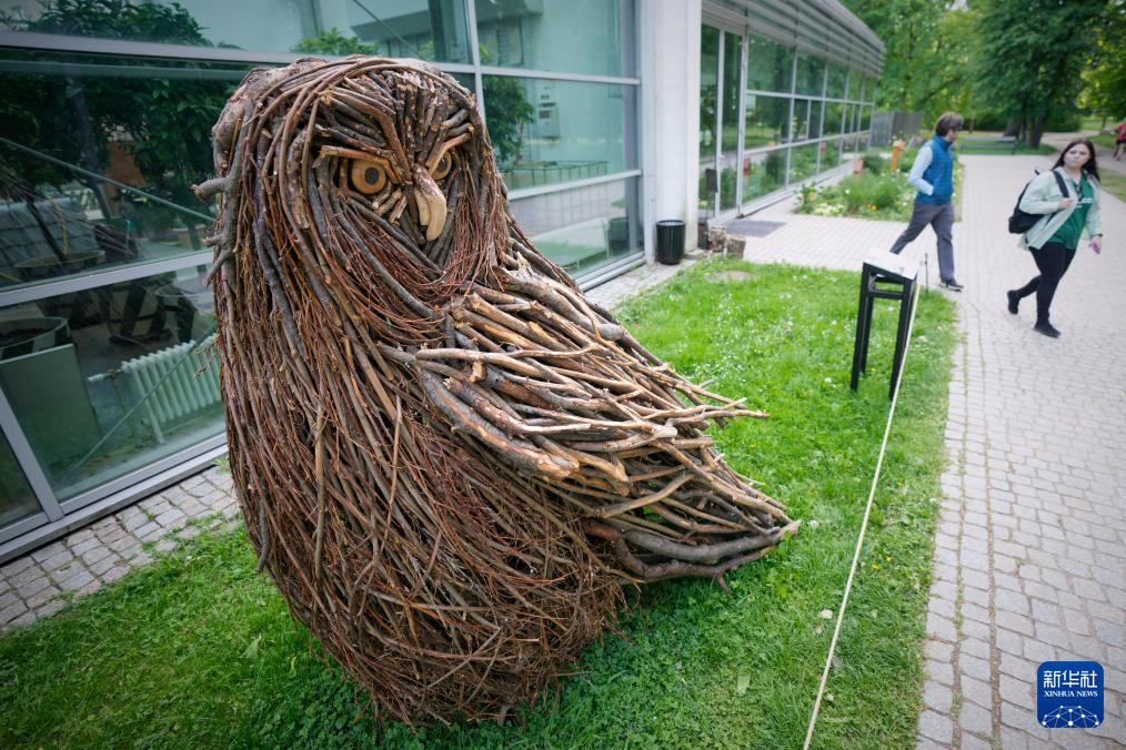 這是5月6日在波蘭首都華沙拍攝的貓頭鷹樹枝雕塑。
