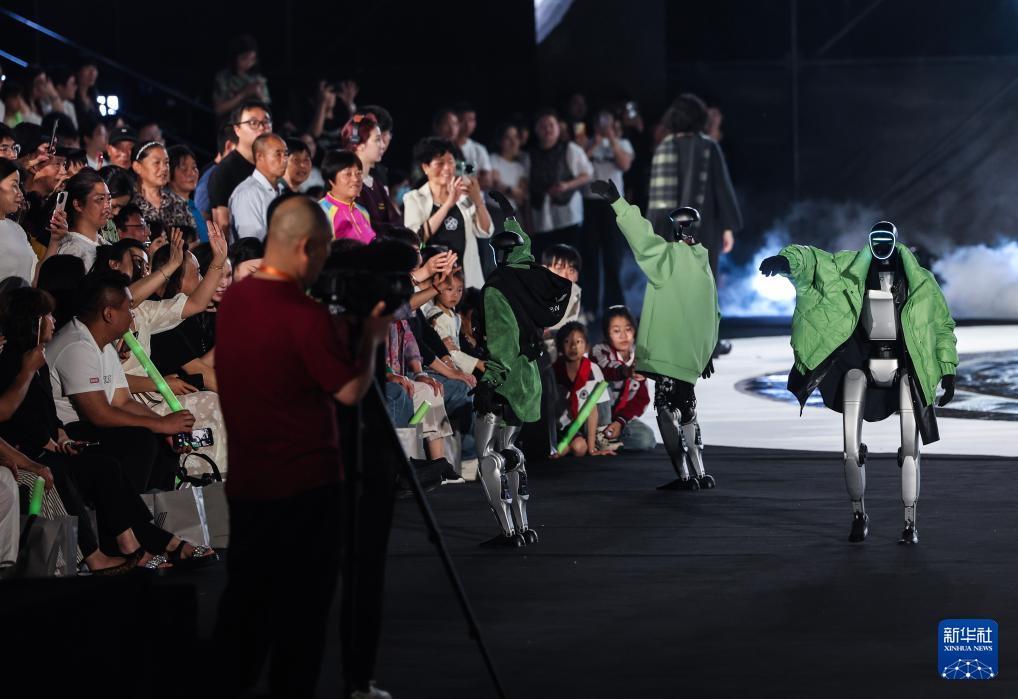 5月7日,在古鎮音樂時裝秀現場,人形機器人與觀眾互動。