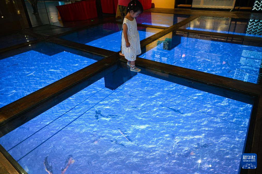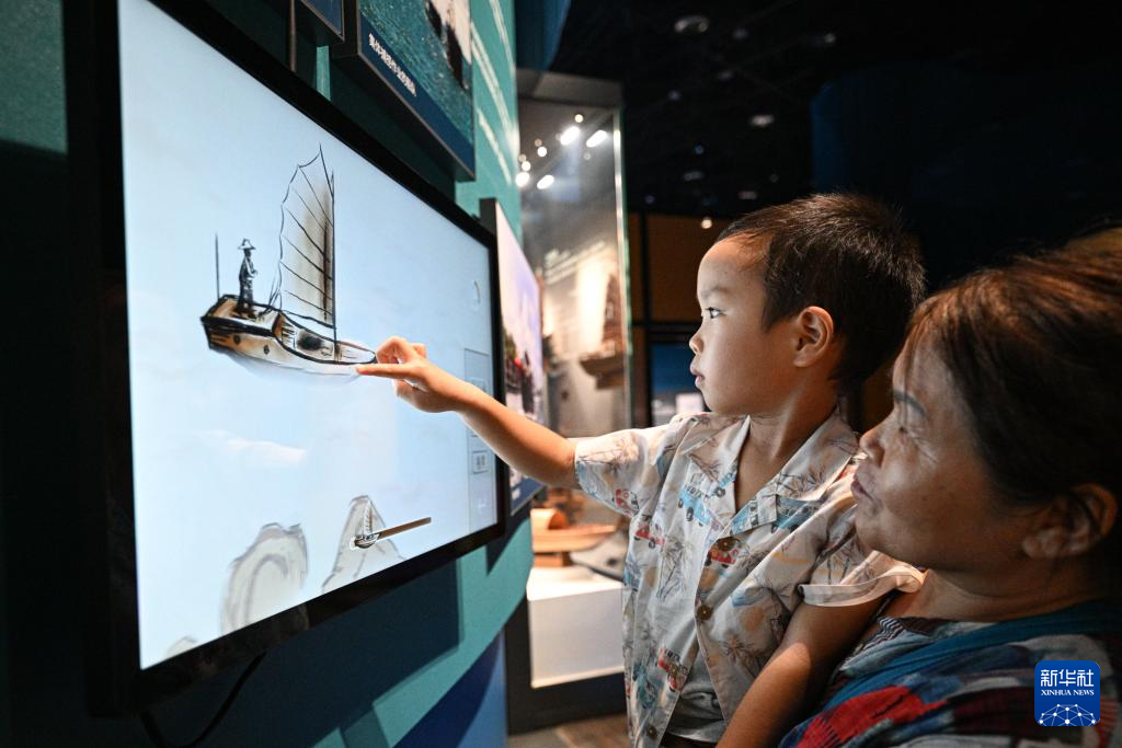 5月13日,游客在海南疍家博物館觀看展現疍家漁排底部水產養殖的動畫。