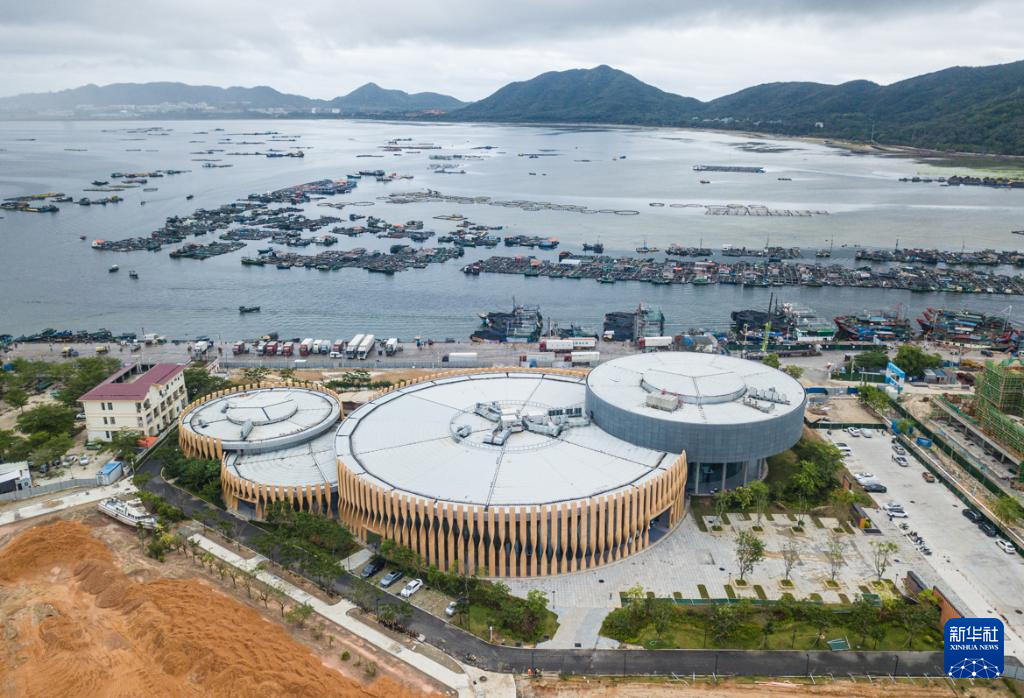 5月13日在海南陵水拍攝的海南疍家博物館,該建筑外觀形似“疍家帽”(無人機照片)。遠處的海面上即是連片的疍家漁排。