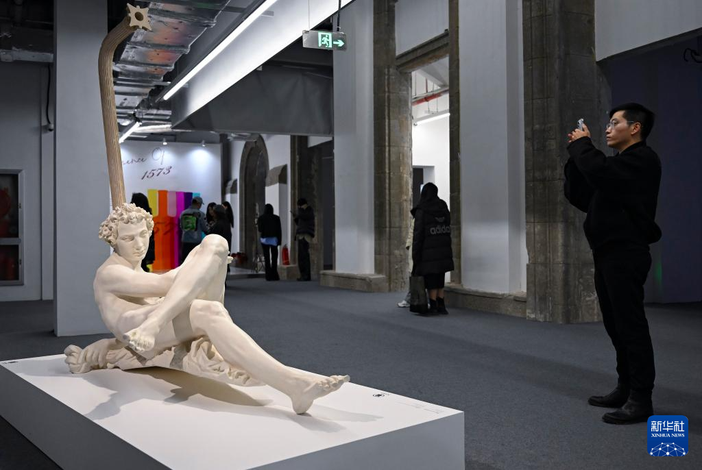 在上海歷史建筑“外灘·老市府”,觀眾在“上海色彩”年度主題展覽中拍攝雕塑作品(2025年1月9日攝)。