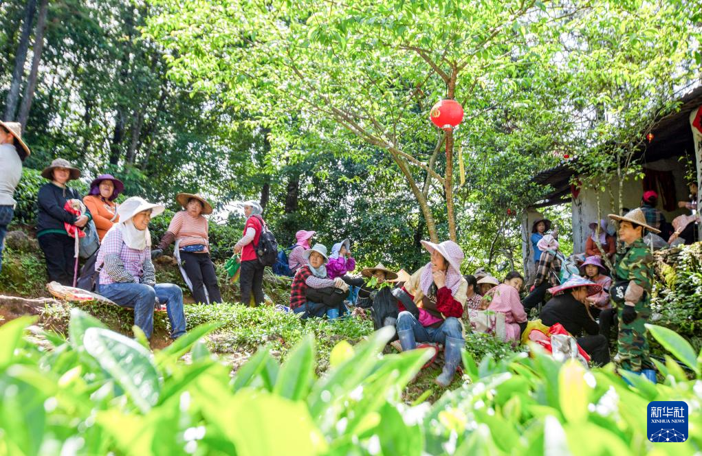 5月6日,采茶工在武夷山一處茶山空地休息交談。