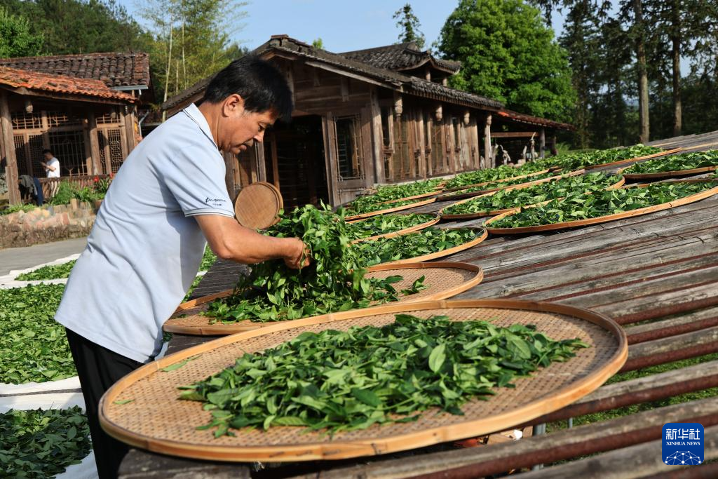 5月3日,武夷山茶農在晾曬青葉,對茶青進行日光萎凋。