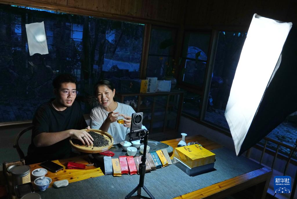 武夷山市星村鎮年輕茶農通過網絡直播推介自己制作的新茶(2024年7月11日攝)。