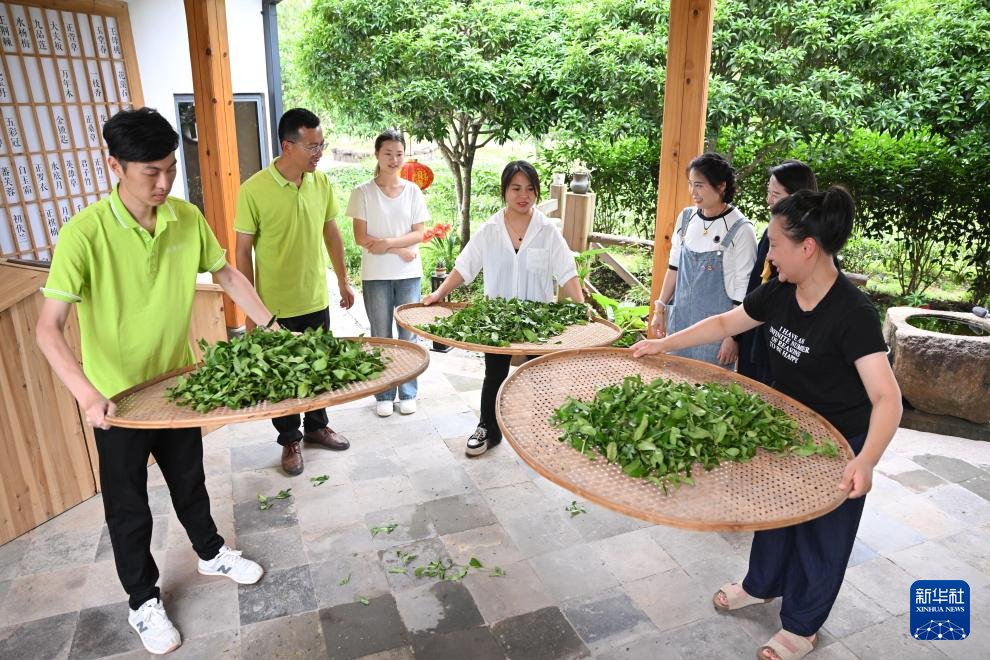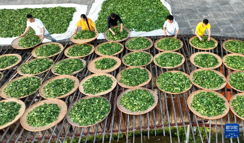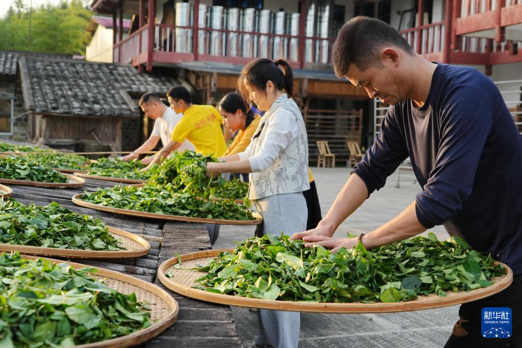 5月2日,國家級非物質文化遺產武夷巖茶(大紅袍)制作技藝縣(市)級代表性傳承人劉峰(右二)帶領茶農對茶青進行日光萎凋。