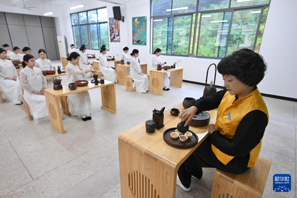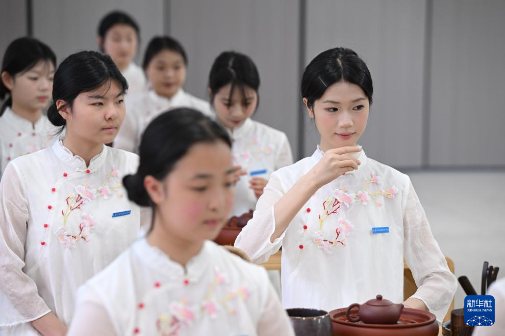 5月8日,武夷山旅游職業中專學校茶藝與茶營銷專業的學生在老師的示范下學習茶藝。
