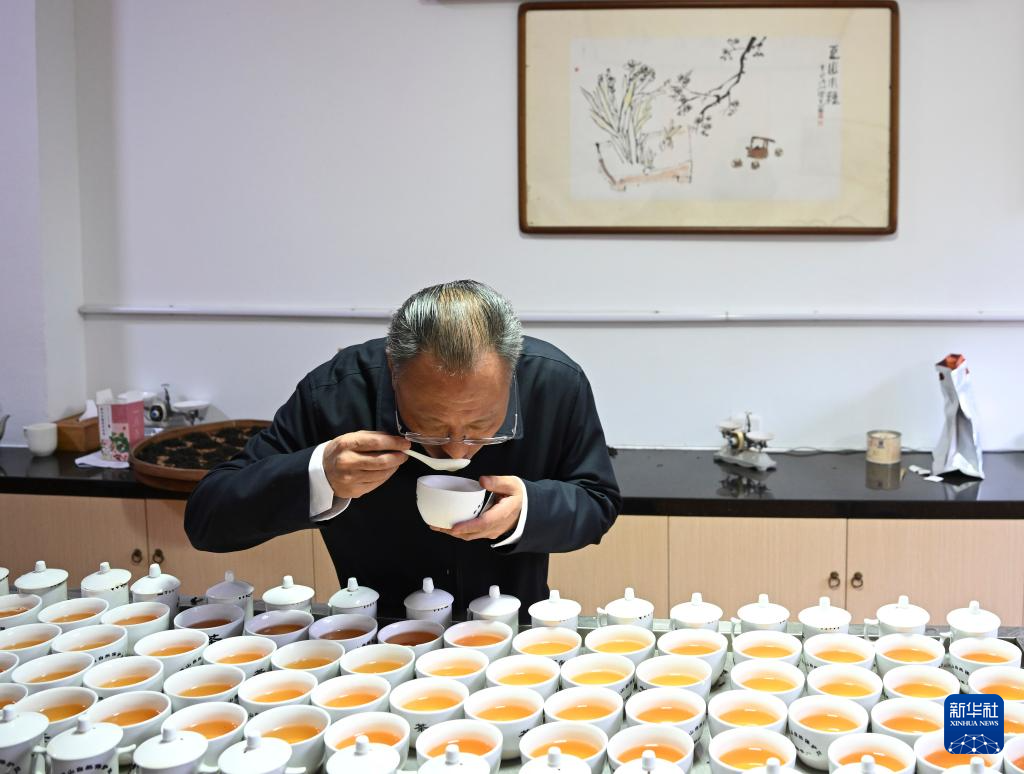 5月9日,福建省武夷山市桐木之星正山小種紅茶茶業專業合作社發起人江元勛在審評新制作的茶。