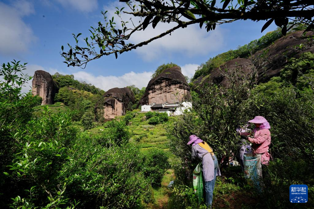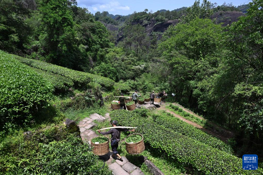 初夏的武夷山,云霧繚繞,溪水潺潺。丹霞碧水間一塊塊蔥郁的茶園內,茶農們背著竹簍,指尖輕輕掐下鮮嫩的葉芽。山道上,挑茶的工人穿梭往來,將新鮮茶葉及時送往加工坊。
