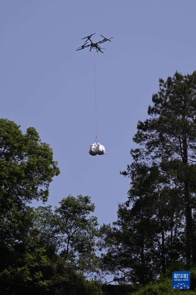 5月6日,武夷山茶園上空無人機在運送茶青。