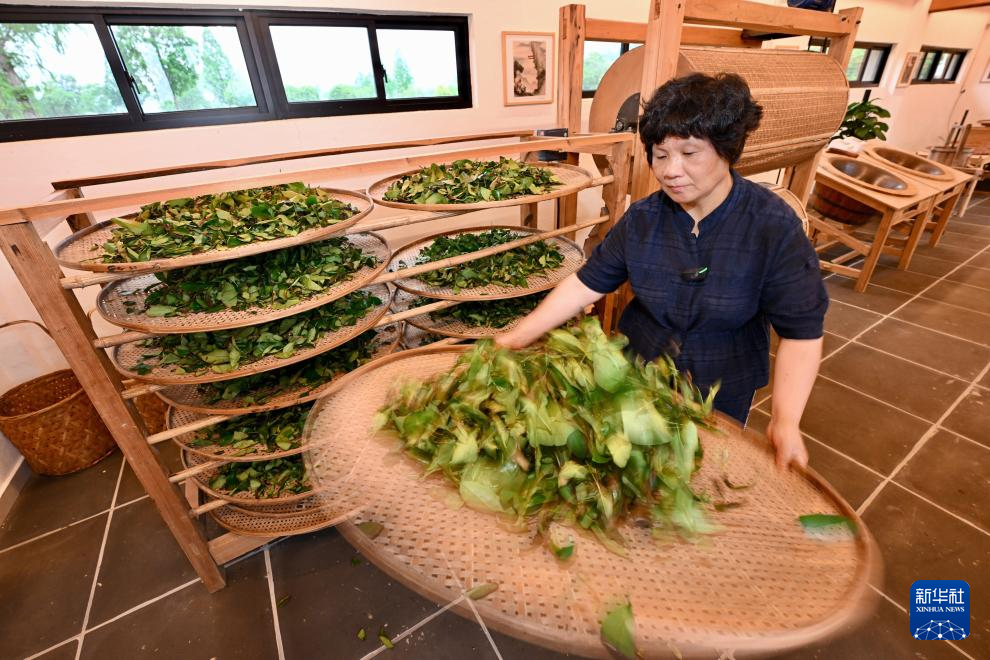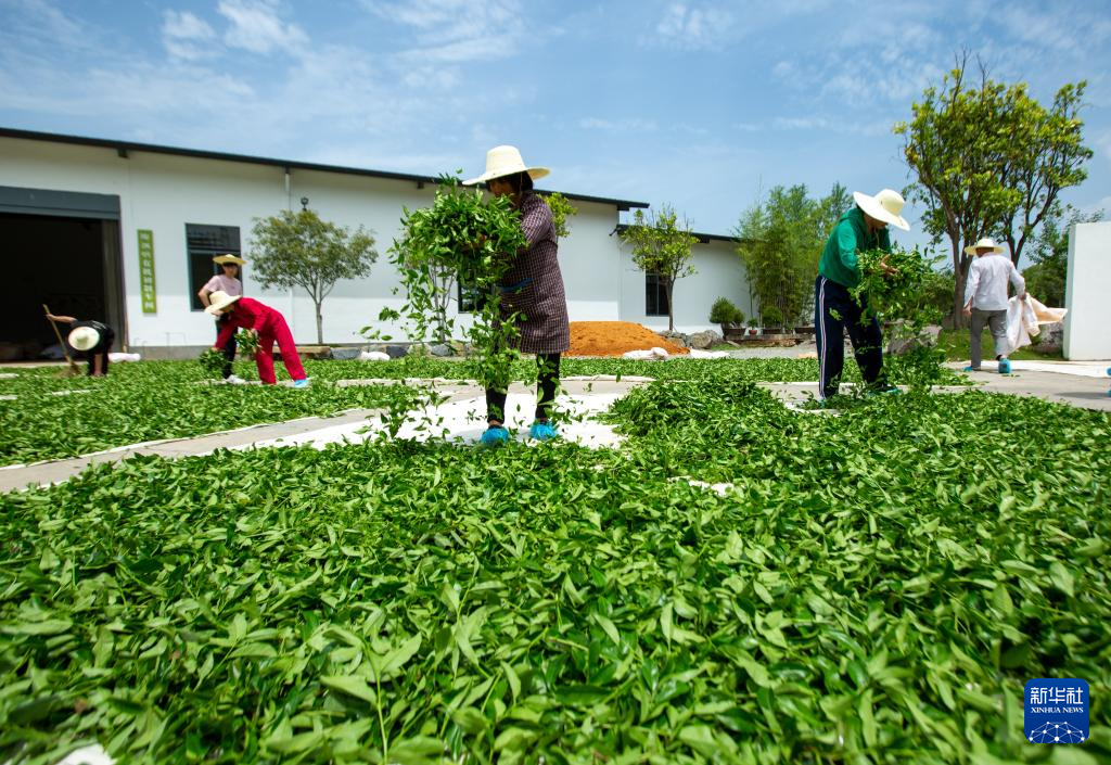 5月7日,工人們在武夷山陶淵明有機茶廠晾曬茶青。