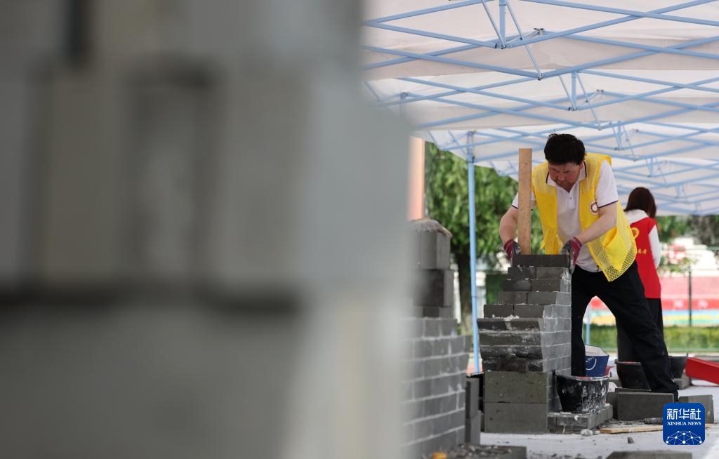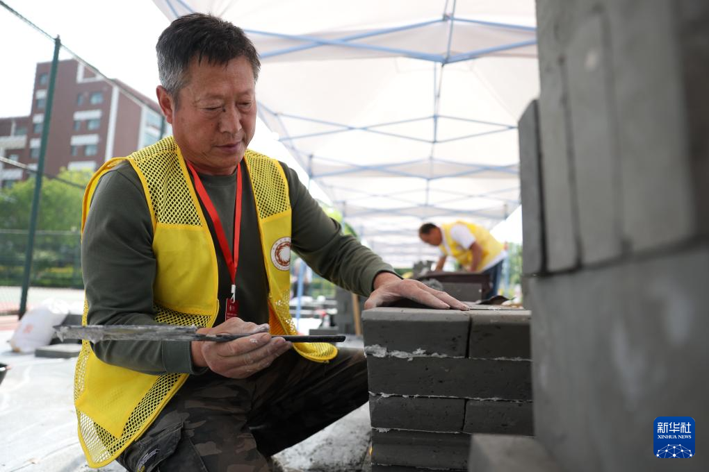 5月22日,來自甘肅昊廷古建工程有限公司的參賽選手盧四海在泥瓦作文物修復比賽中。