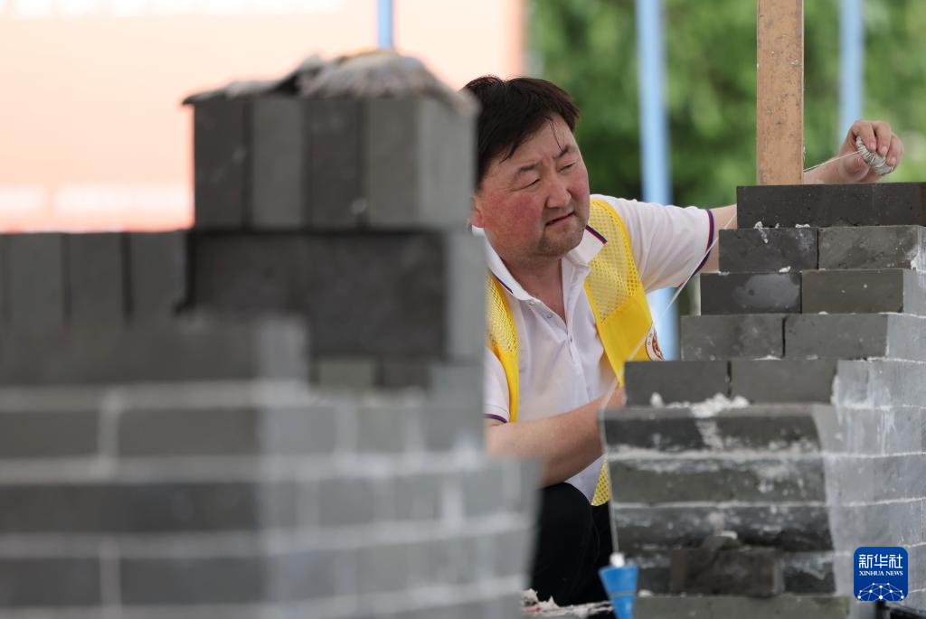 5月22日,來自甘肅永靖白塔工匠技術咨詢有限公司的參賽選手王太恒在泥瓦作文物修復比賽中。