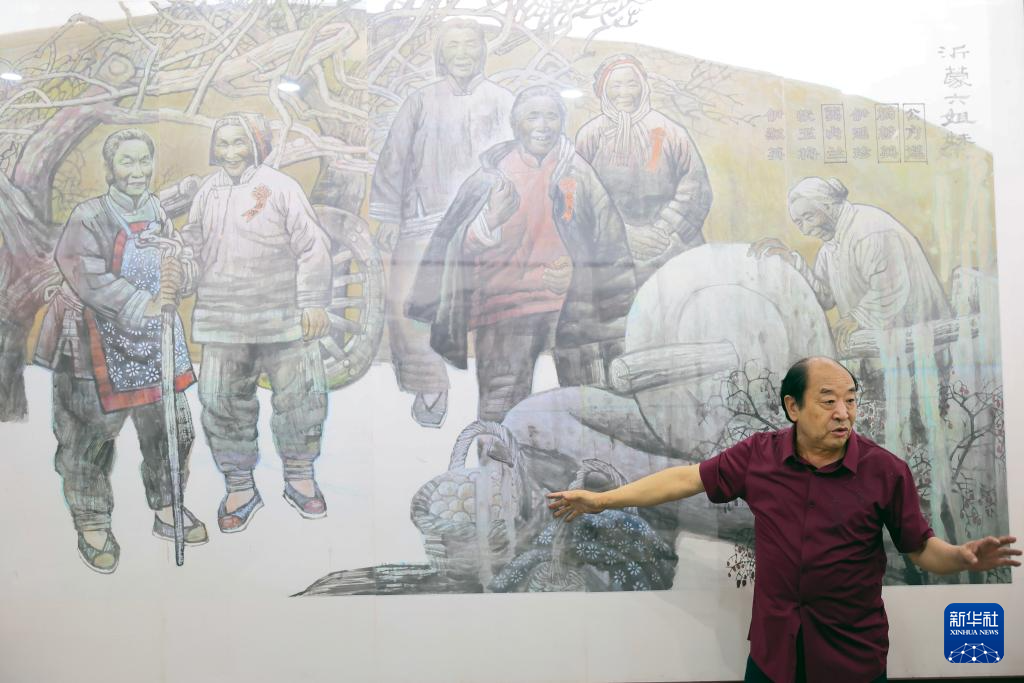 5月24日,在莒縣沂蒙畫派研究院,畫家何乃磊為小學生們講述沂蒙畫派代表作品《沂蒙六姐妹》的故事。