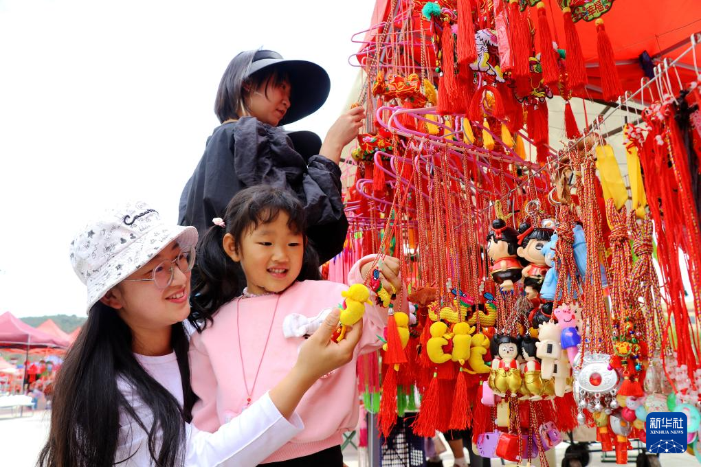 5月24日,在甘肅省平涼市靜寧縣成紀文化城廣場,人們在選購香荷包。