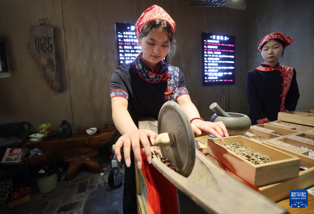 5月24日,在山東省臨沂市沂南縣銅井鎮竹泉村,傳統手工藝人在搗碎中藥材,準備制作香囊。