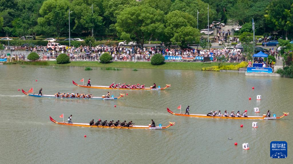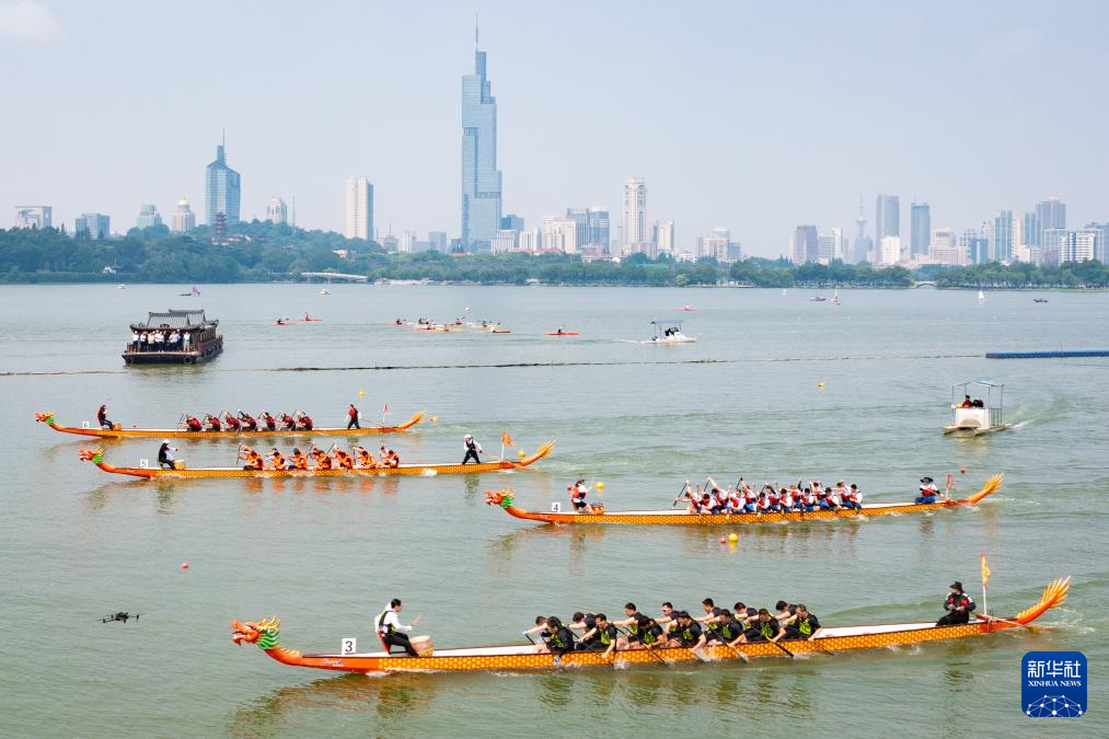 5月24日,龍舟隊伍在南京玄武湖上競逐(無人機照片)。