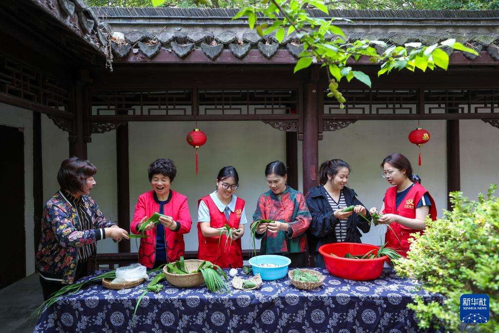 5月24日,在位于江蘇省興化市昭陽街道的興化書院,青年志愿者和社區居民一起包粽子。