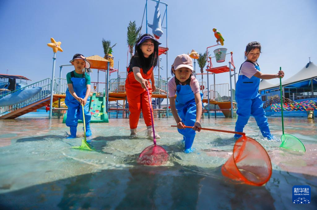 5月24日,游客在河北省遵化市南山常樂谷景區水世界參加親子撈魚活動。