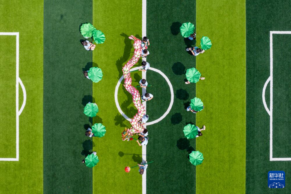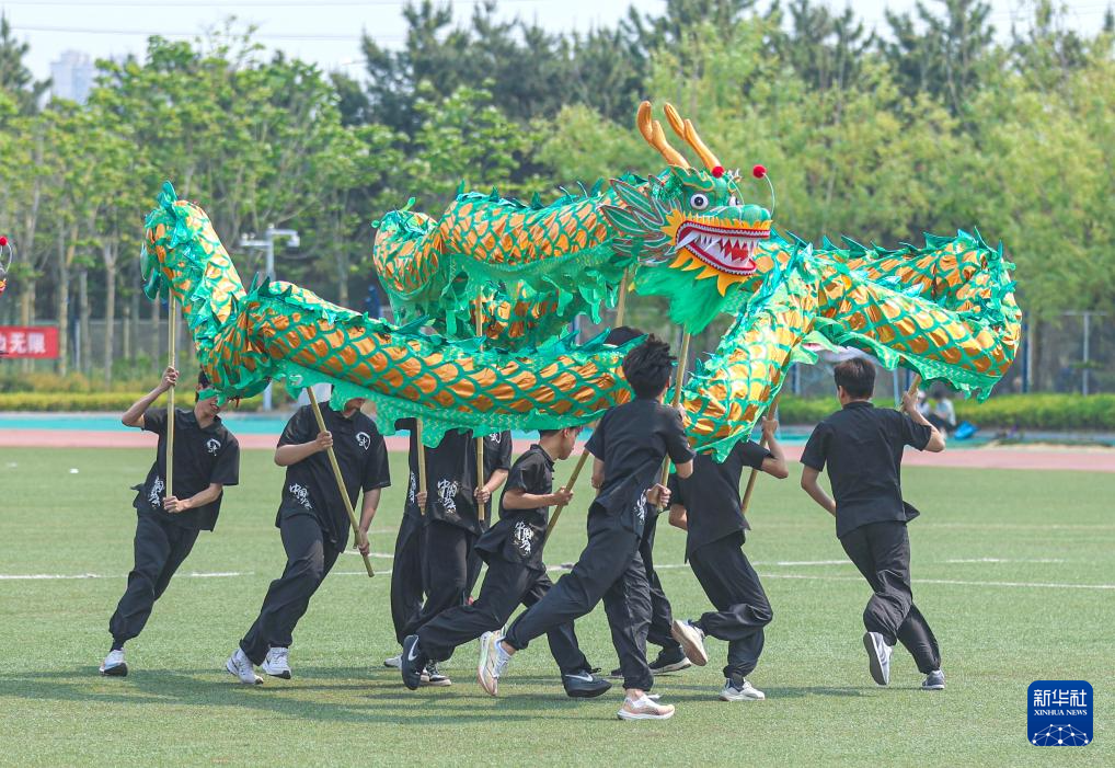 5月27日,山東省榮成市威海海洋職業學院操場上,學生們在進行舞龍表演。