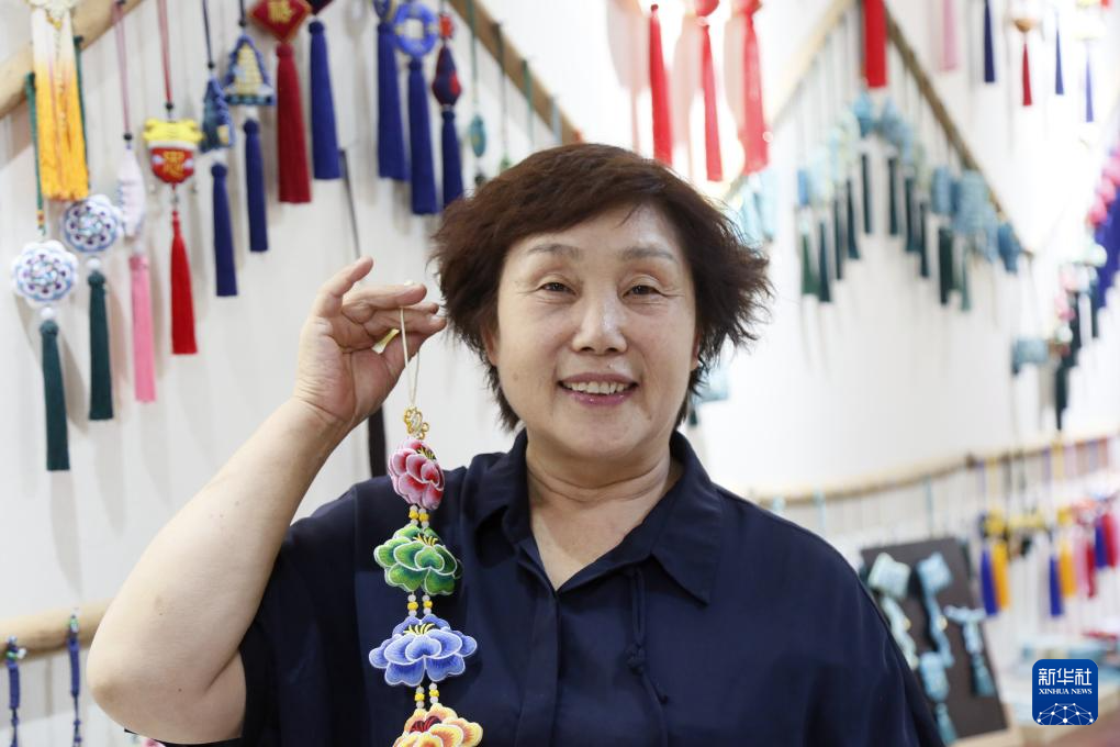 5月27日,河南省洛陽市汝陽縣三屯鎮丁溝村李阿婆香包第三代傳人李水琴在展示制作的香包。