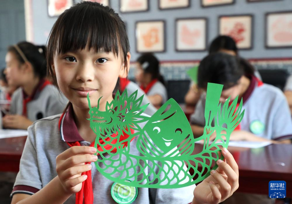 5月26日,在江蘇省蘇州市胥江中心小學校開展的“傳統民俗迎端午”主題剪紙活動,一名學生展示剪紙作品。