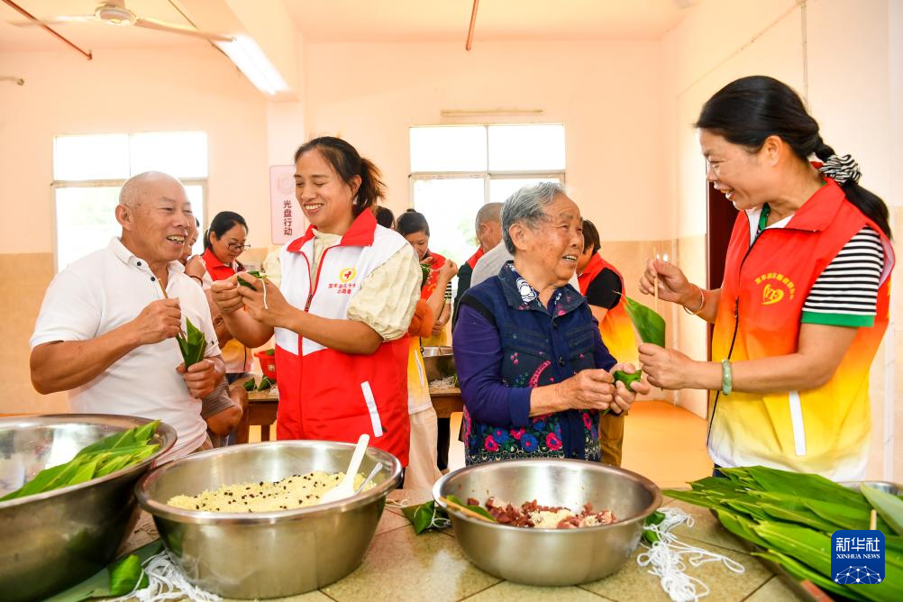 5月26日,江西省宜春市宜豐縣新昌鎮敬老院,志愿者和老人一起包粽子。