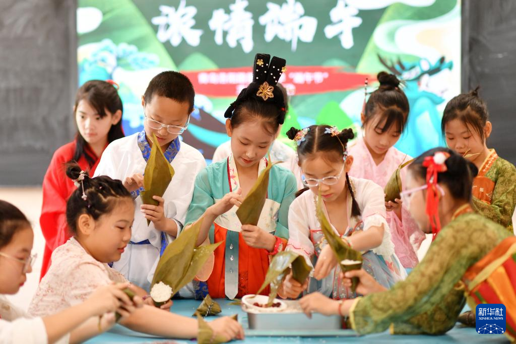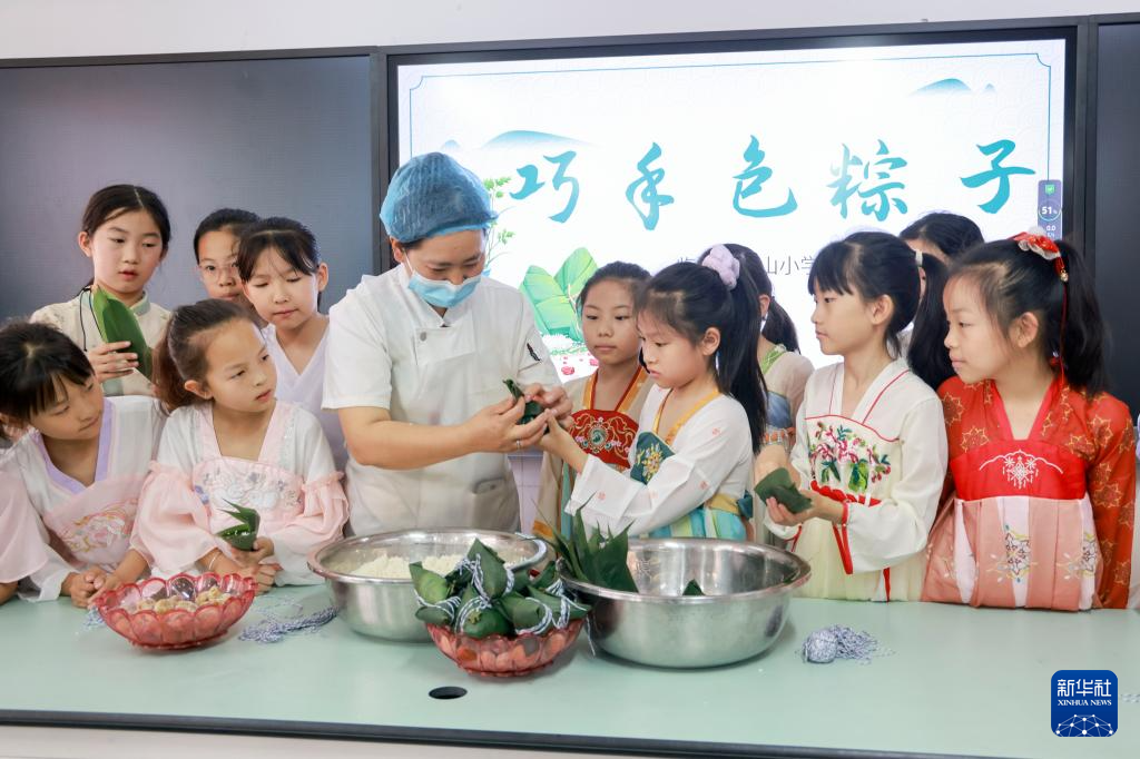 5月27日,在山東省臨沂市銀雀山小學,食堂阿姨教學生包粽子。