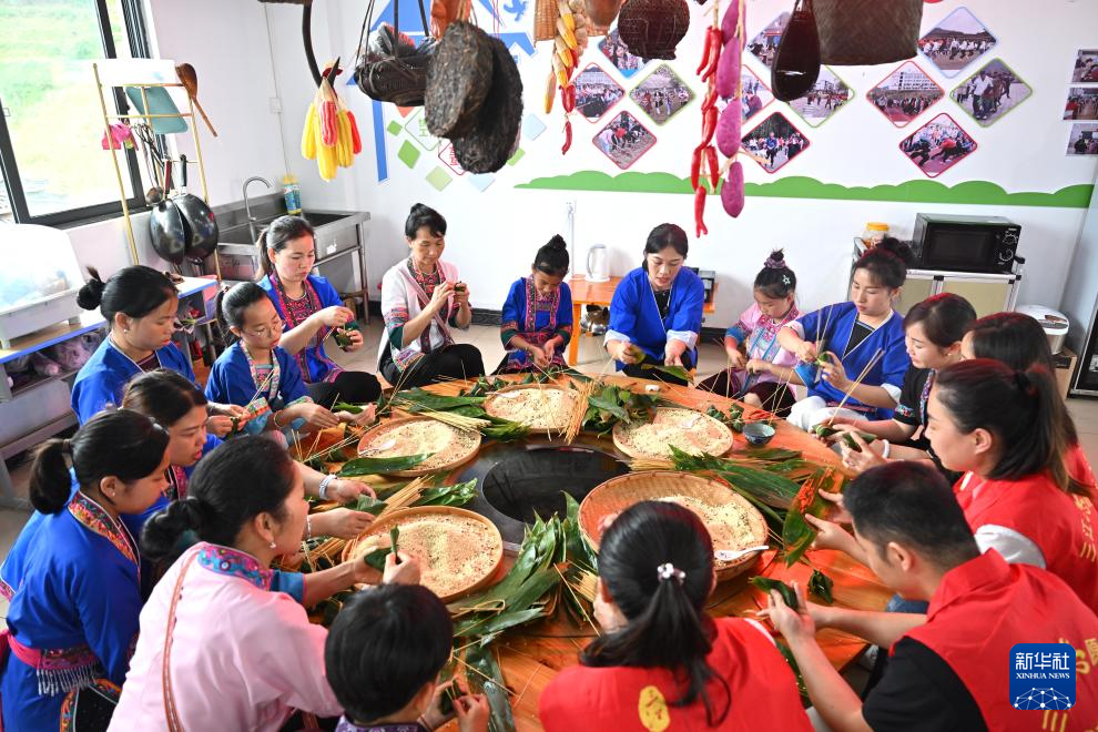 5月23日,在廣西柳州市三江侗族自治縣古宜鎮江川小學,學生、家長一起學習制作三江粽。
