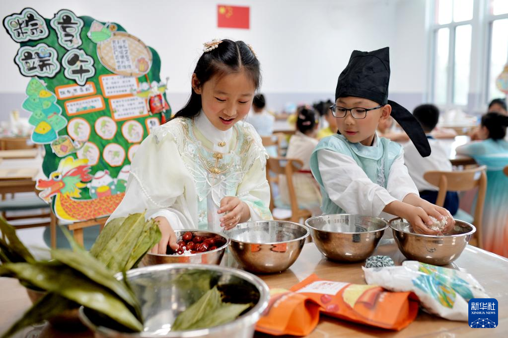 5月26日,在山東省青島市市北區杭州路小學開展的“粽享端午”主題活動中,兩名學生準備包粽子食材。