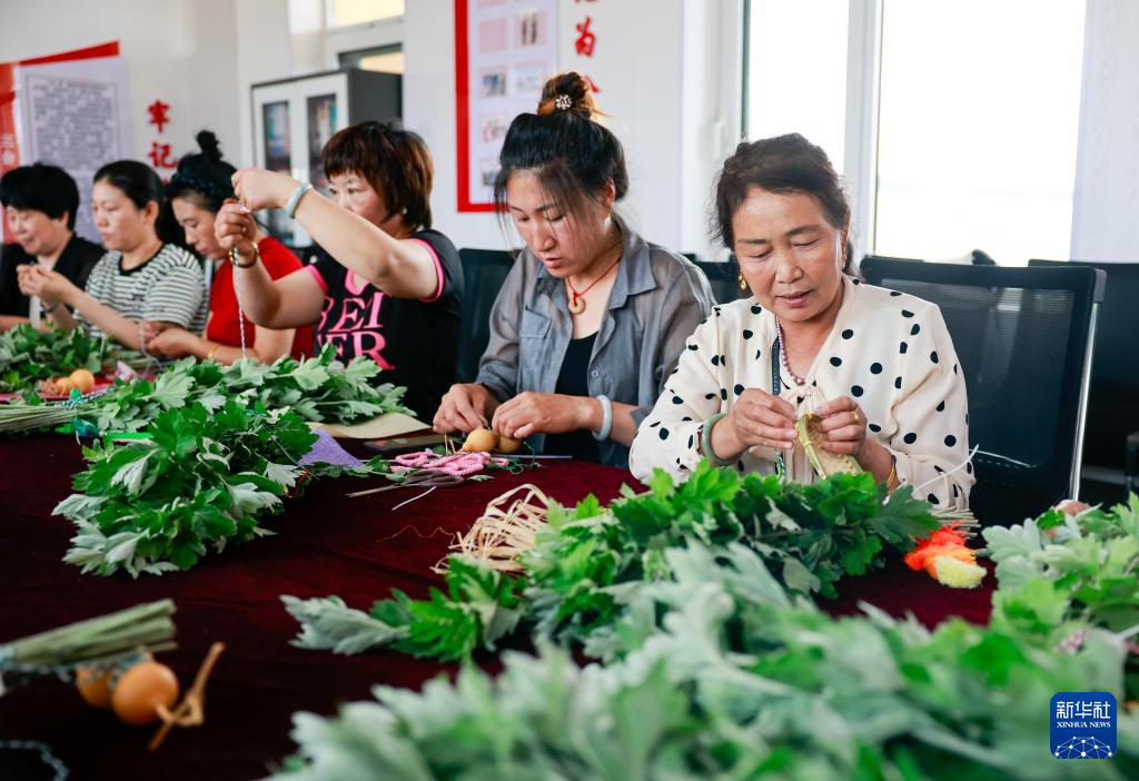 5月27日,村民在河北省唐山市豐南區王蘭莊鎮高家圍村活動中心學習制作艾草掛件。
