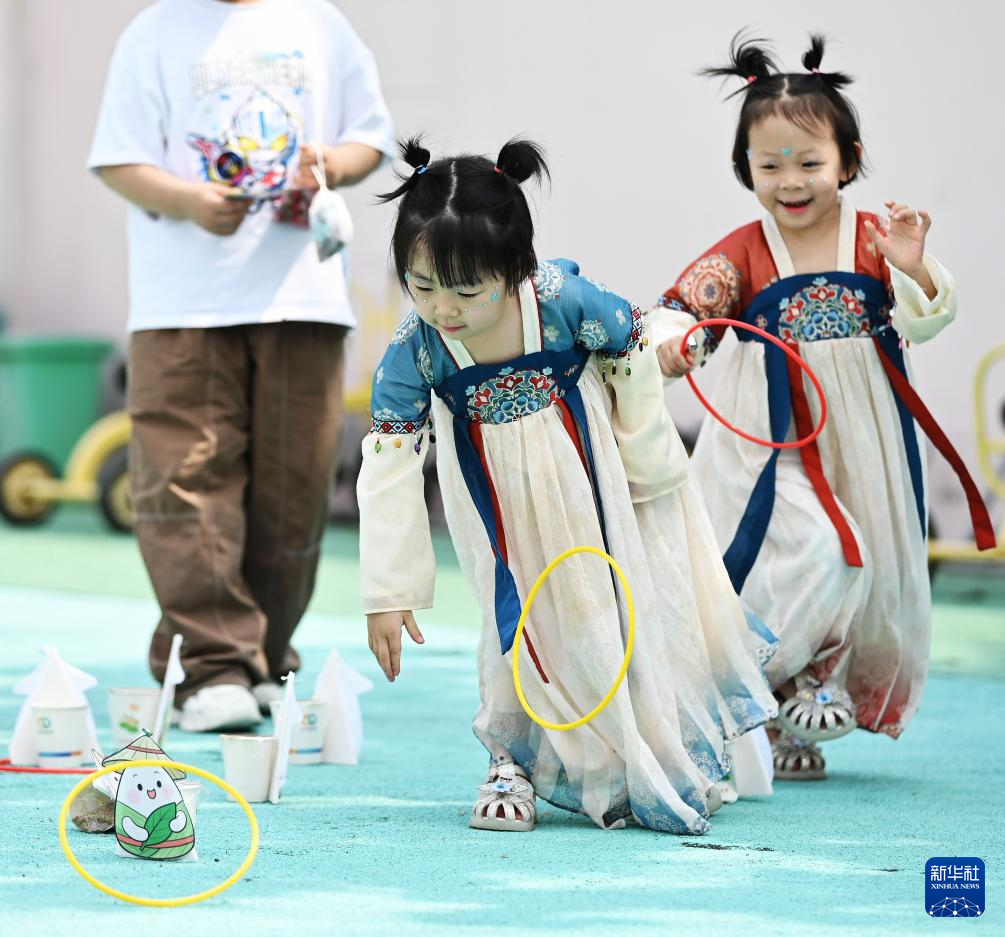 5月27日,小朋友們在山東省滕州市西崗鎮中心幼兒園玩“趣味套圈”游戲。