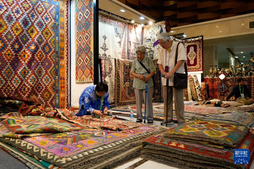 5月28日,在成都國際非遺節“魅力非遺·國際大展”現場,參觀者在了解阿富汗地毯。