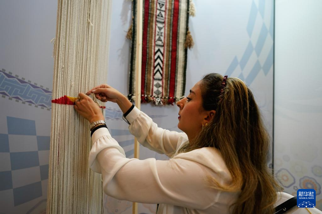 5月28日,在成都國際非遺節“魅力非遺·國際大展”現場,科威特手藝人編織羊毛紡織品。
