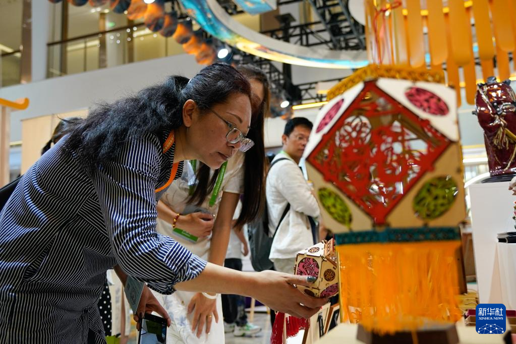 5月28日,參觀者在國際非遺品牌IP授權交易活動上了解佛州花燈。