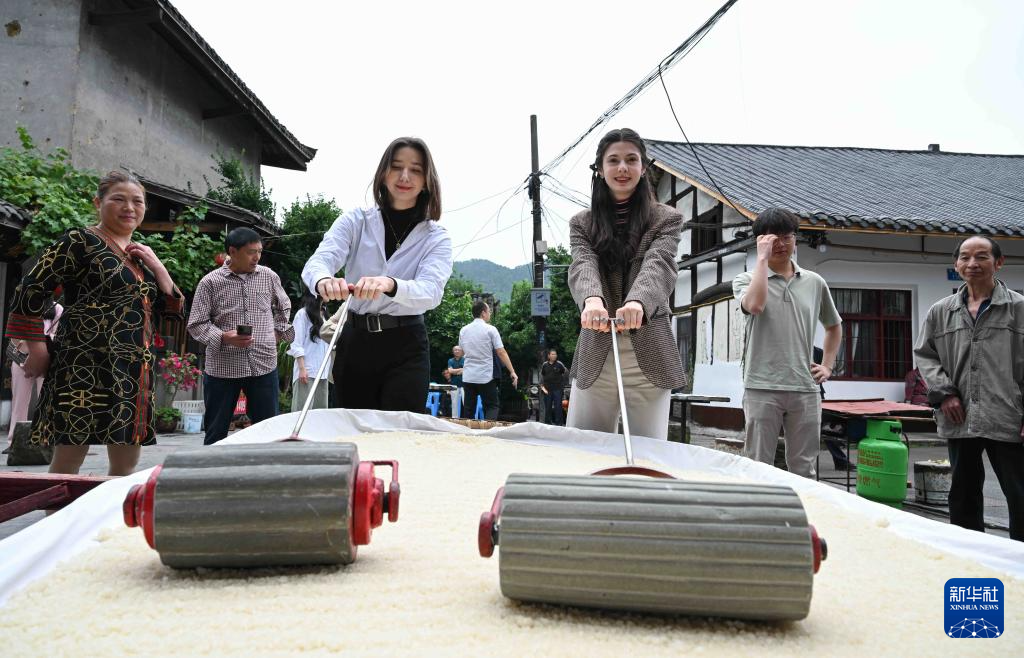 5月28日,在重慶市巴南區豐盛古鎮,就讀于重慶大學的俄羅斯留學生奧莉(左三)與哈薩克斯坦留學生瑪麗(右三)一同體驗糍粑的制作過程。