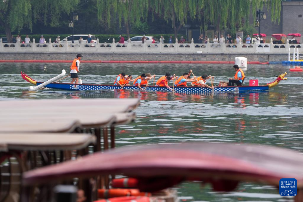 5月29日,2025中國大運河文化帶京杭對話配套活動“河之端”龍舟賽在北京市西城區什剎海進行,中央民族大學國際龍舟隊在比賽中。