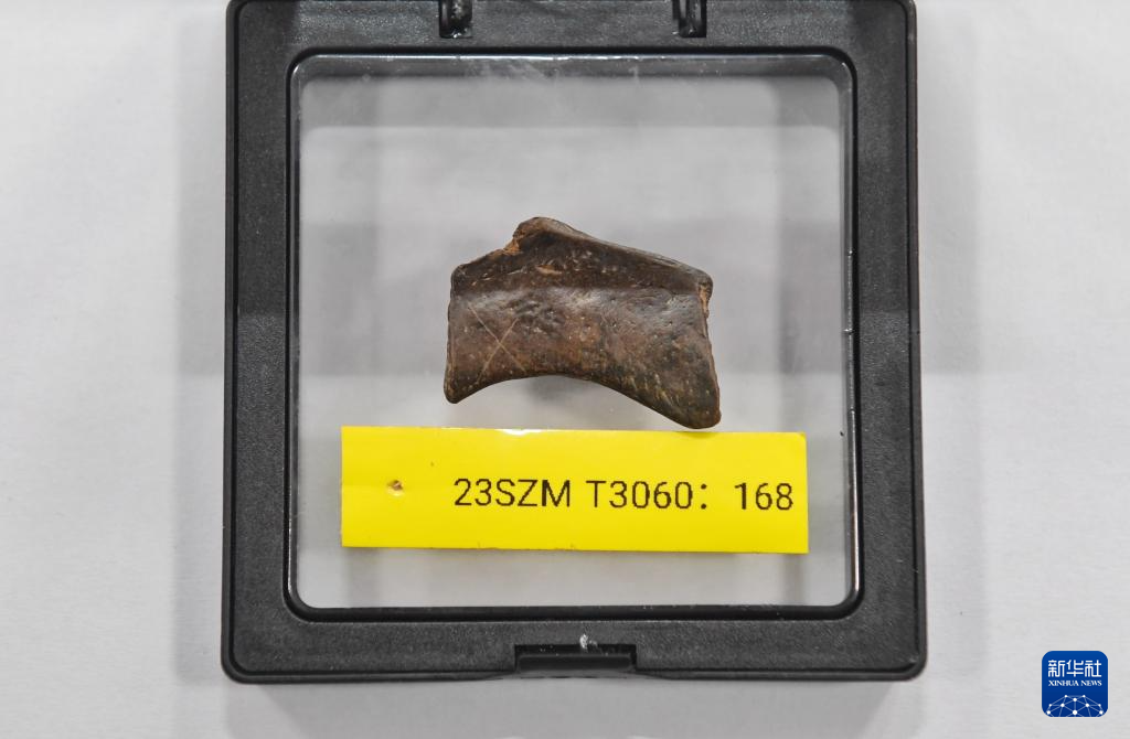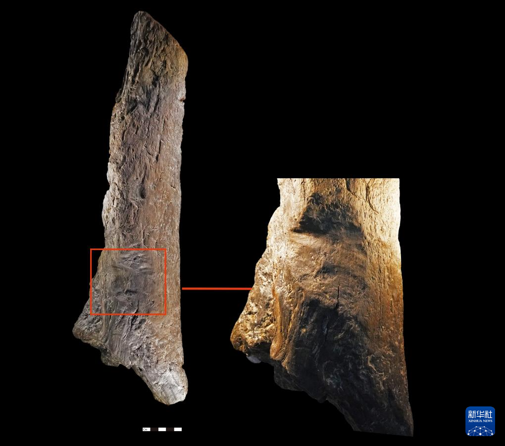 這是從四川資陽濛溪河遺址群出土的有X形劃痕的骨器(2023年12月5日攝)。新華社記者 劉坤 攝