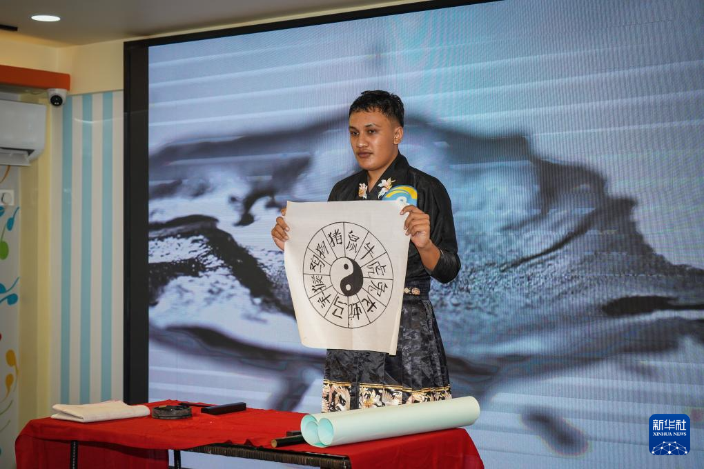 5月30日,在尼泊爾勒利德布爾,一名選手在第18屆“漢語橋”世界中學生中文比賽尼泊爾賽區決賽上展示書法作品。新華社發(哈里·馬哈爾詹攝)