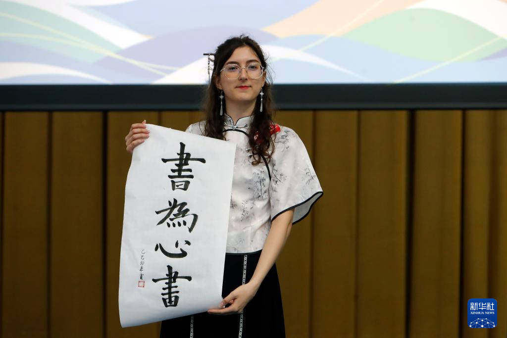 5月31日,在羅馬尼亞首都布加勒斯特,一名選手在第18屆“漢語橋”世界中學生中文比賽羅馬尼亞賽區決賽上展示書法作品。新華社發(克里斯泰爾攝)