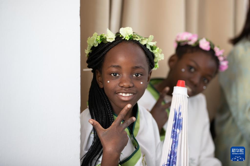 5月30日,在贊比亞首都盧薩卡,兩名女孩在第24屆“漢語橋”世界大學生中文比賽和第18屆“漢語橋”世界中學生中文比賽贊比亞賽區決賽現場等待參加演出。新華社記者 彭立軍 攝