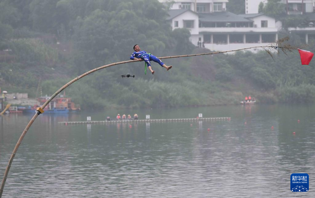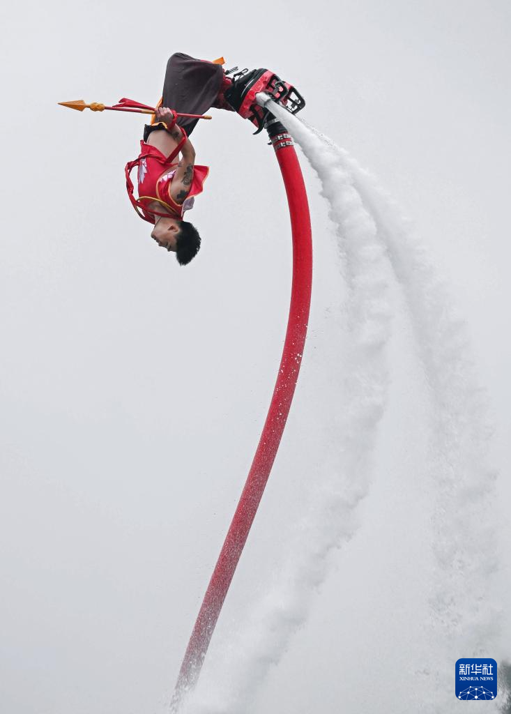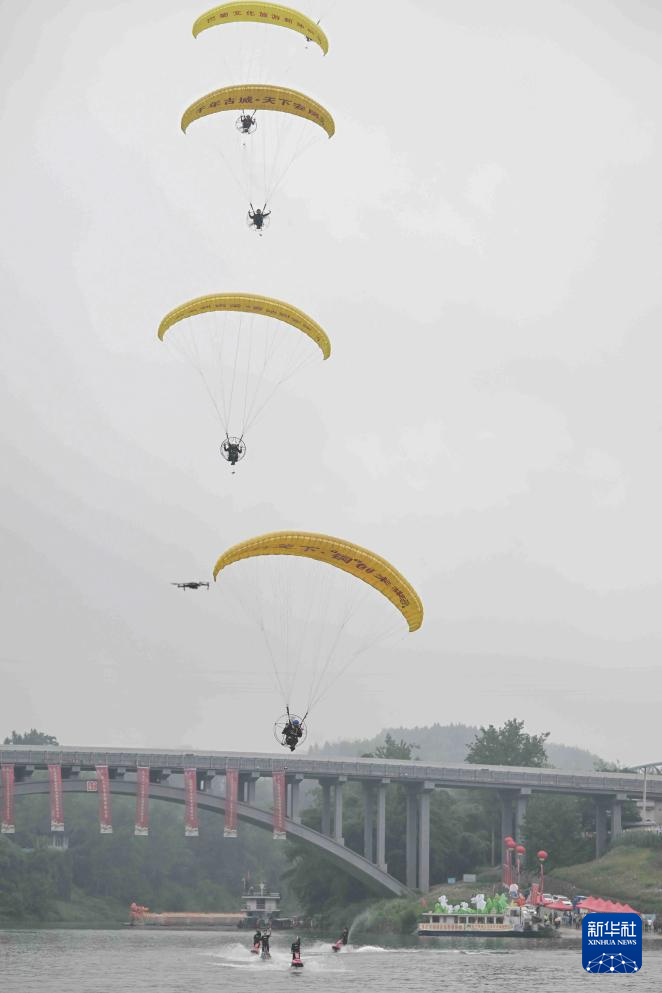 5月31日,特技演員在重慶市銅梁區安居古城進行空中和水上的特技表演。