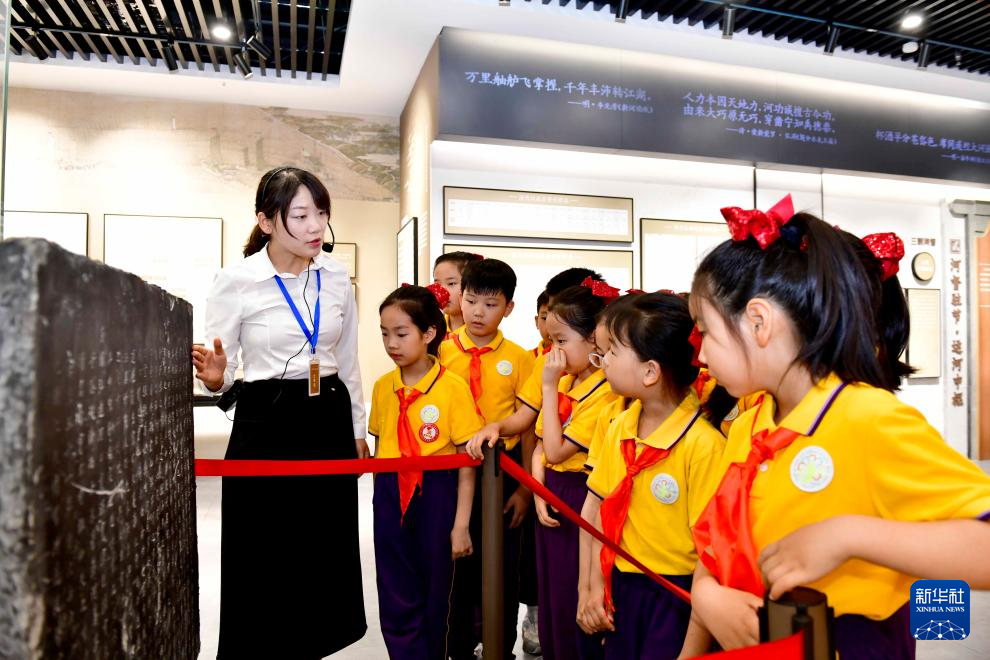 6月6日,在位于山東省濟寧市任城區的河道總督署遺址公園展館,講解員在為濟寧市霍家街小學學生講解。