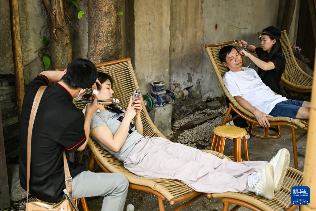 6月8日,游客在重慶市渝中區山城巷體驗采耳服務。