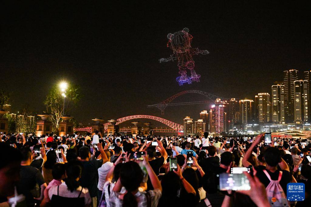 5月2日晚,游客在重慶朝天門廣場觀看無人機燈光秀。